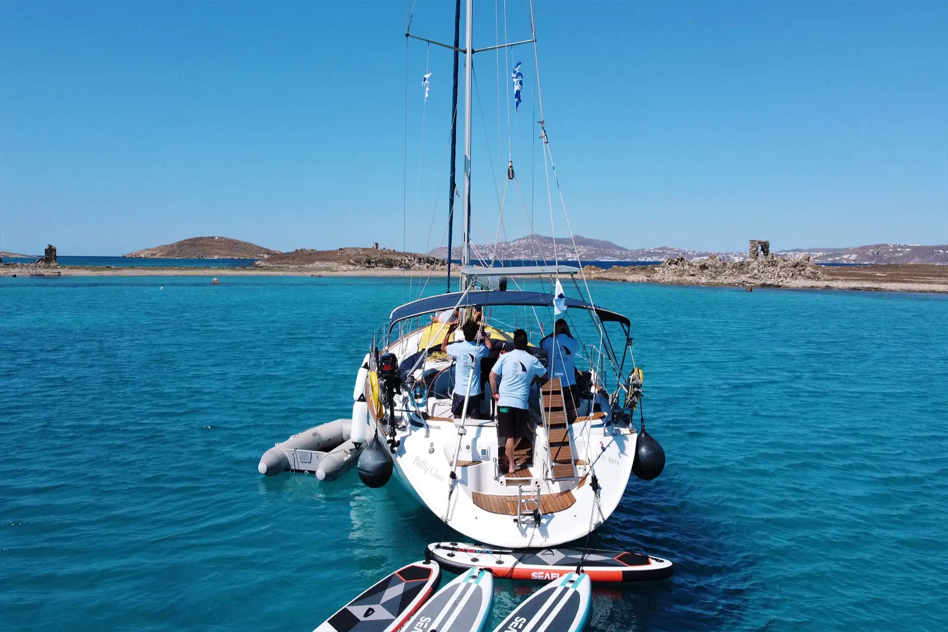 Our skilled skippers know the island’s coastline inside out, so your experience is always protected. If strong winds make sailing uncomfortable, our team offers an alternative island experience, guiding you to beautiful southern beaches and hidden spots across Mykonos. With Doukas Sailing, your day is never cancelled.